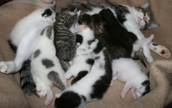 Welche Auswirkungen das Füttern von Anifit hat, zeigte sich schon nach kurzer Zeit. Nicht nur, dass unsere Minka, die trotz wenigem Essen sehr rund ist und zu viele Kilo auf die Waage bringt, seit Anifit viel agiler geworden ist und unser 14 Jahre altes Sorgenkind Gisi (stark Nierenkrank) auf einmal mit Appetit wieder isst, nein unsere Pinki, ist am 13. September Mutti von sage und schreibe 10 Babys geworden. Eine Sensation, wie die Tieraerztin meinte, denn so etwas kenne sie nur aus dem med. Buch, allerdings nur mit acht Baby´s. Per Kaiserschnitt mussten die Kaetzchen geholt werden. Max. vier Babys gab die Tieraerztin vorab eine Ueberlebenschance, jedoch waren alle 10 Baby´s putzmunter.